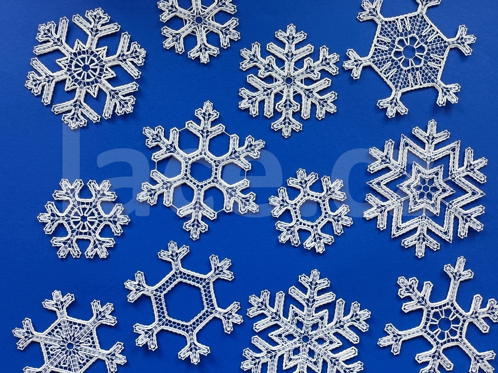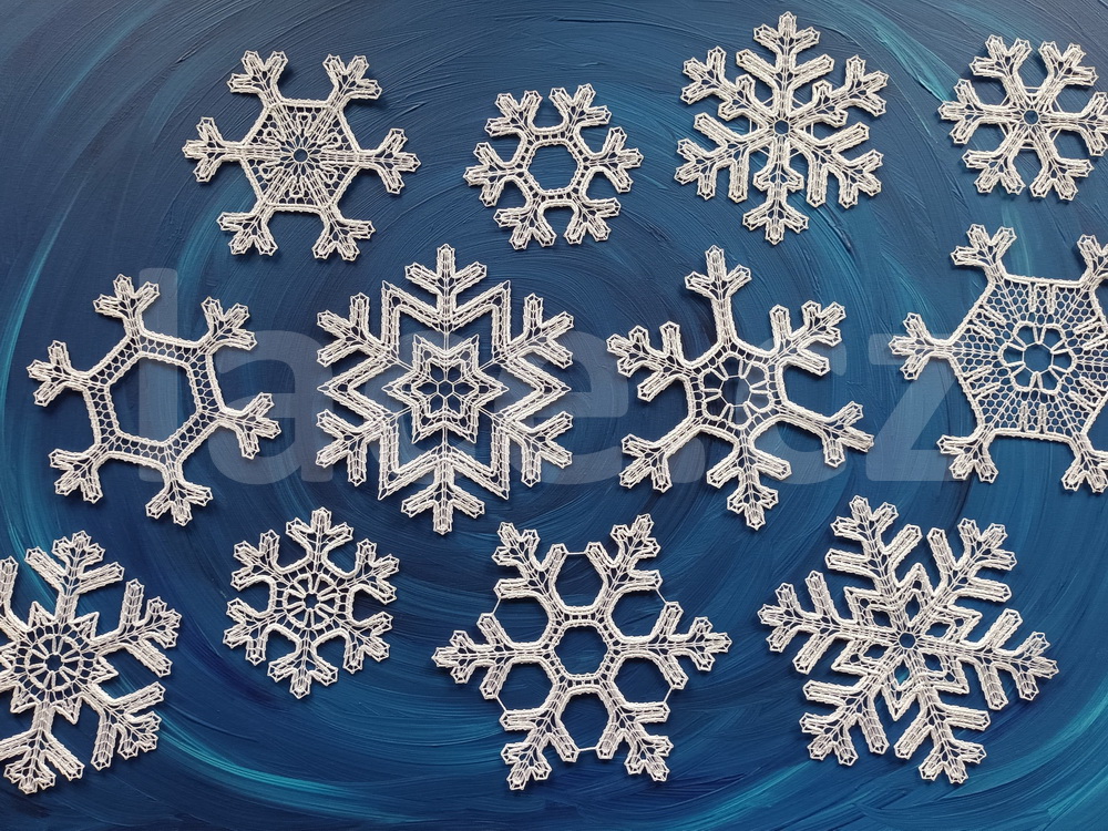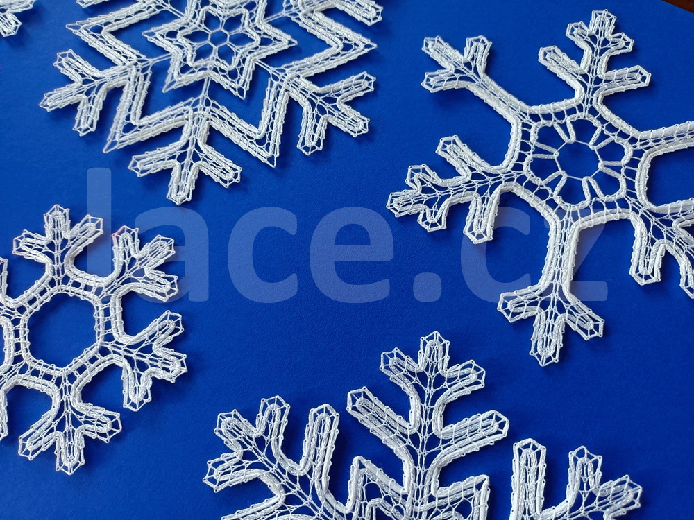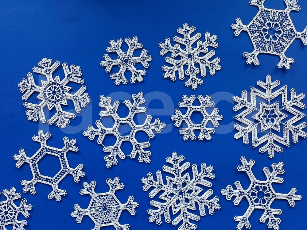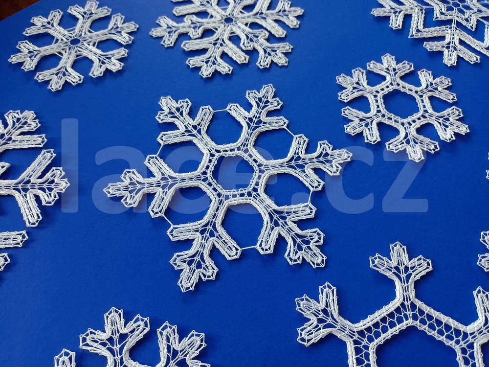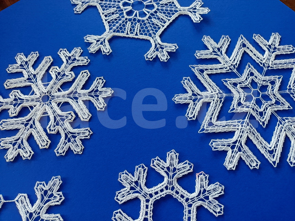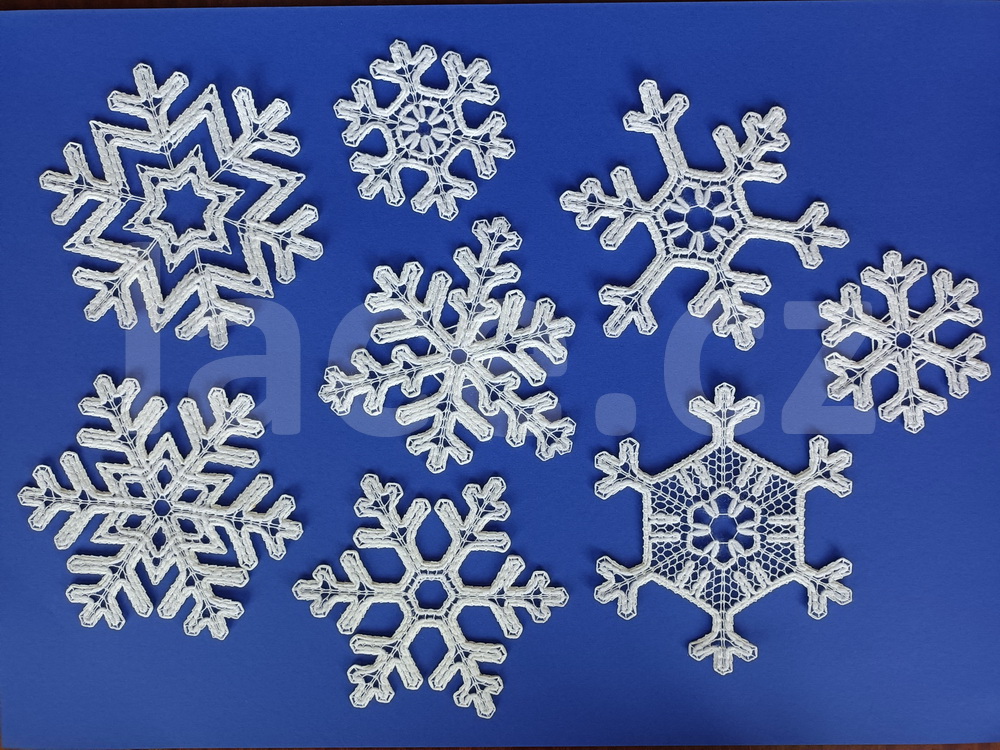 Soubor 12 podvinků pro paličkování sněhových vloček technikou vláčkové krajky. Velikost od 9,7 do 15,5 cm. Jsou upaličkované ze stejných nití jako předchozí řady Ledových krystalů, Ledových krystalů 2, Ledových květů a Minikrystalů, které hezky doplňují a rozšiřují, jak na stromečku, tak i v oknech apod.