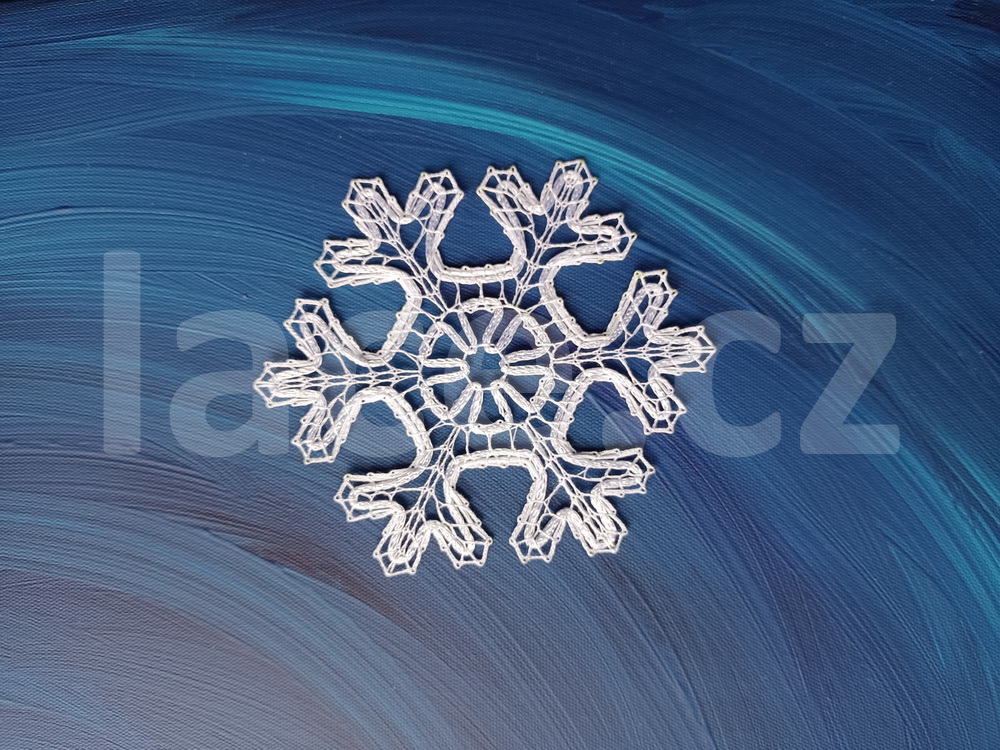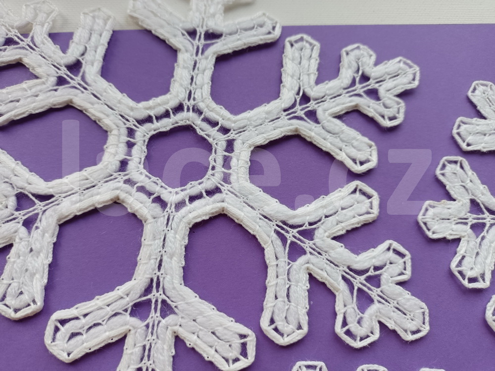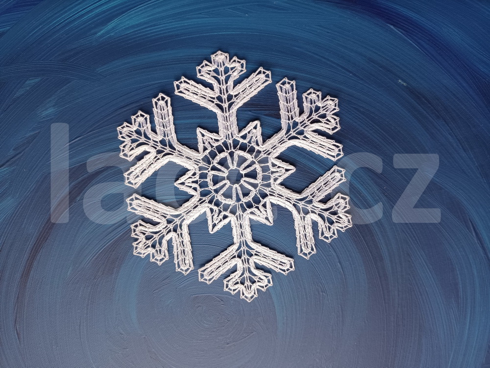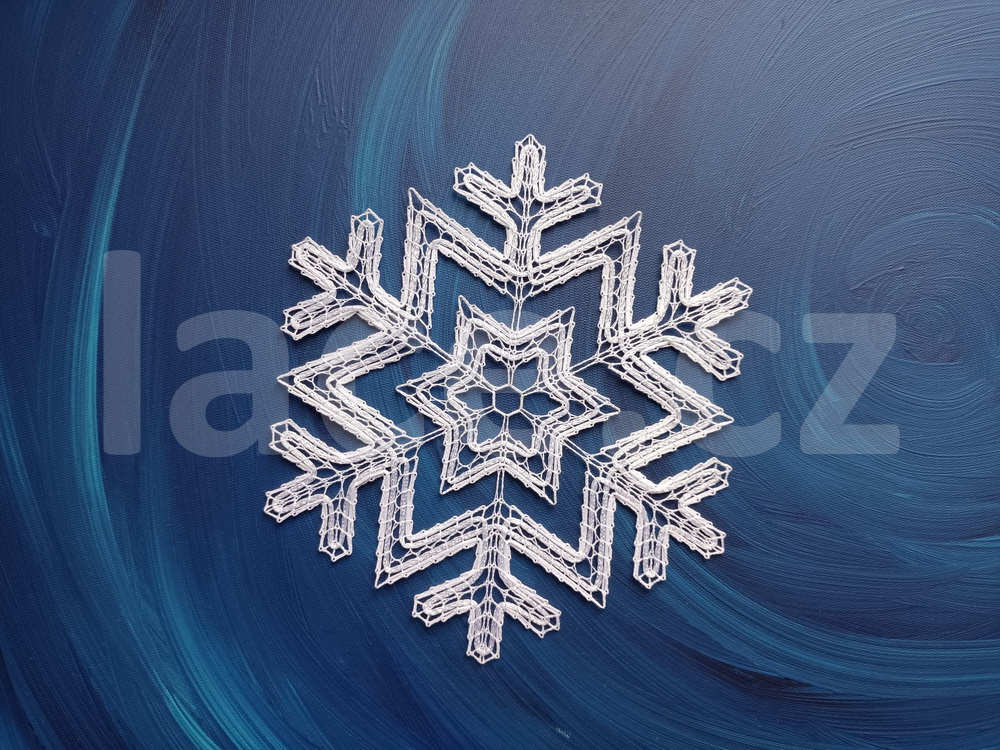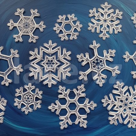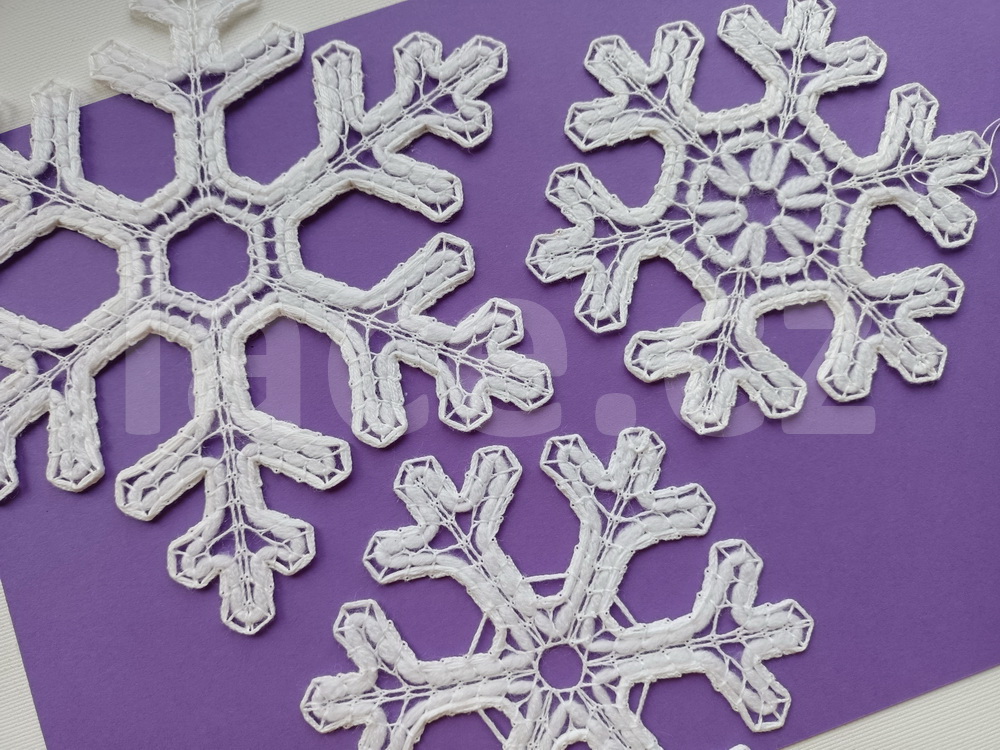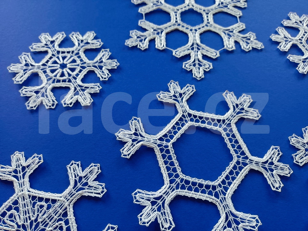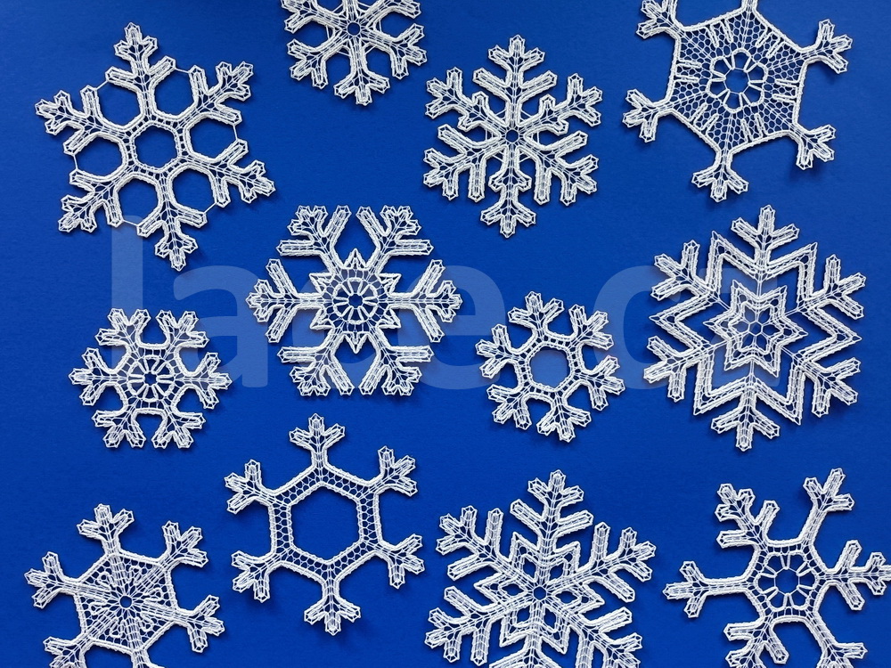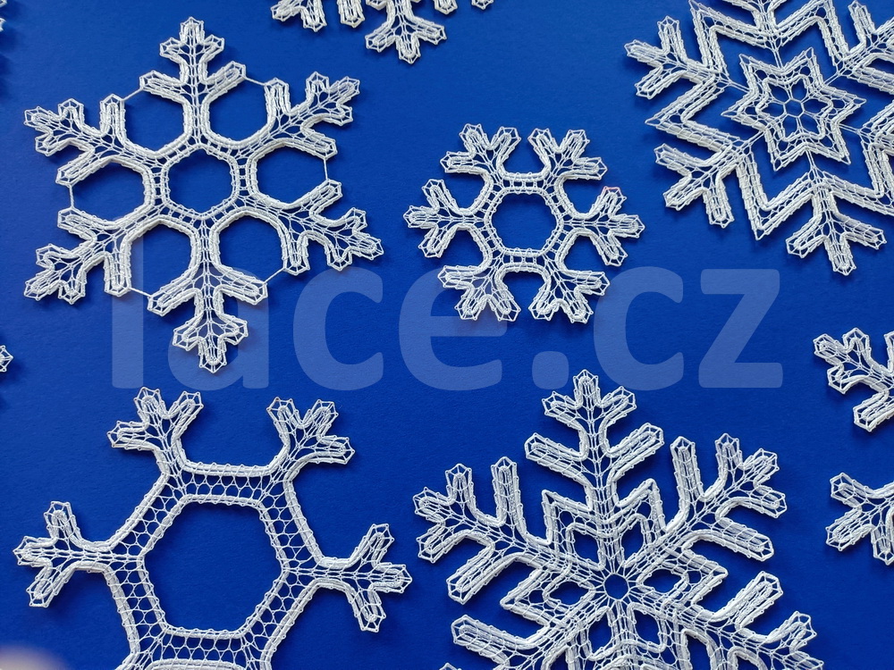 Soubor 12 podvinků pro paličkování sněhových vloček technikou vláčkové krajky. Velikost od 9,7 do 15,5 cm. Jsou upaličkované ze stejných nití jako předchozí řady Ledových krystalů, Ledových krystalů 2, Ledových květů a Minikrystalů, které hezky doplňují a rozšiřují, jak na stromečku, tak i v oknech apod.